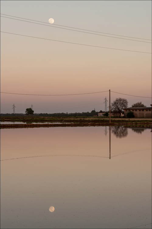 E' molto bella! Se posso dire la mia, sarebbe stata perfetta se la luna fosse stata "funambola" anche nel riflesso; d'altra parte capisco che non sarebbe stato il massimo indossare gli stivaloni ed entrare nella risaia per trovare l'inquadratura perfetta