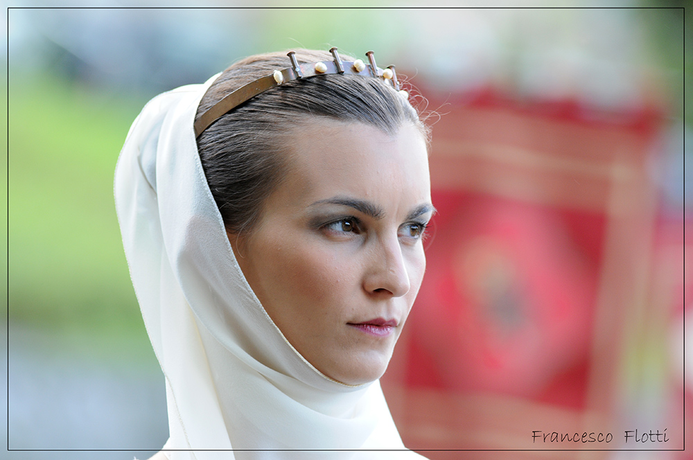 Bella l'intensità dello sguardo della figurante, corretta l'esposizione che lascia morbidezza e luminosità ai bianchi del tessuto.