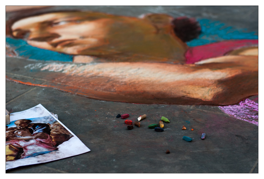 Nell'abusato genere "madonnari" questa è una buona realizzazione che dà un buon risalto all'aspetto dei colori, aggiungendo un dinamismo con la visione spiccatamente anamorfica dell'opera e gli affianca i mozziconi di gessetto colorati e l'immagine "originale" da cui l'artista (invisibile) trae ispirazione. La carica di energia data dalla sottolineatura dei colori pieni e saturi la trovo ben funzionale al risultato finale.