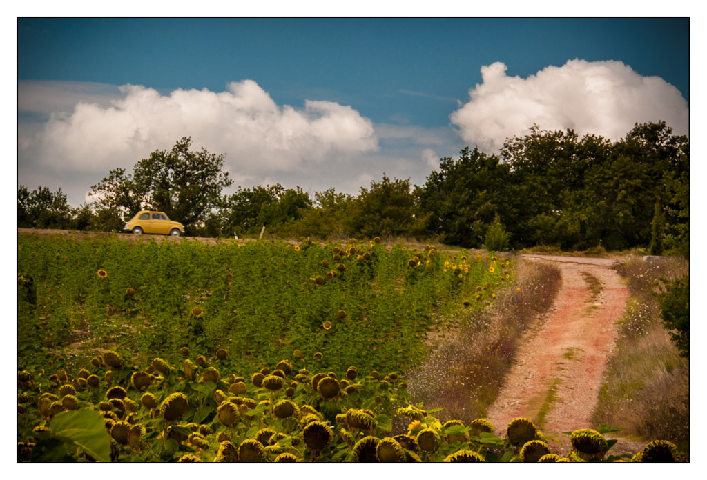 A prima vista mi sembra un po' troppo scaldata, nel senso di bilanciamento del bianco, ma sono gusti personali. La vignettatura e la composizione mi piacciono anche se la 500 è un po' piccolina ed i girasoli si perdono un po' nonostante il collegamento tentato con strada. Ovviamente bisogna fare i conti con il posto ed il momento, quindi è quasi inutile da dire, ma forse un punto di ripresa più alto avrebbe aiutato.