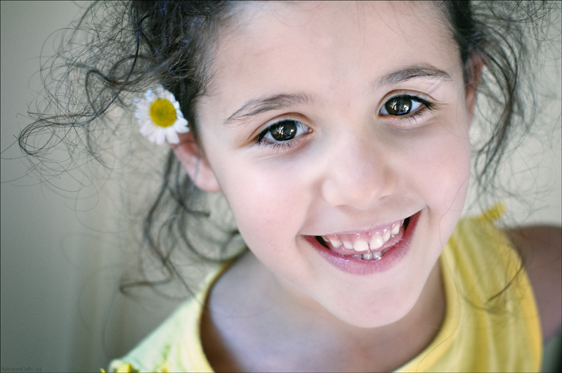 Il sorriso è totale, coinvolge tutta la mimica facciale, la bocca, gli occhi ed è enfatizzato dall'espandersi solare del giallo, che si fa gemma nel pistillo della margherita e tenerezza nel nostro cuore.