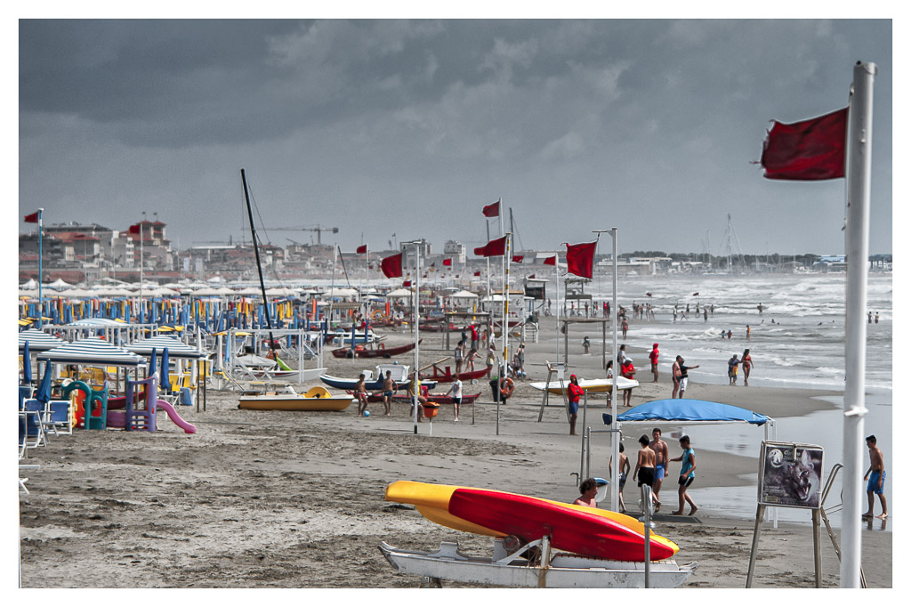Mi pare che il rosso soffra di un eccesso di saturazione: forse spiccava egualmente con un'inquadratura verticale concentrata sulle bandiere del lungomare. Peccato che in primo piano non ci sia qualcuno di più leggibile e significativo del signore coperto dalla barca.