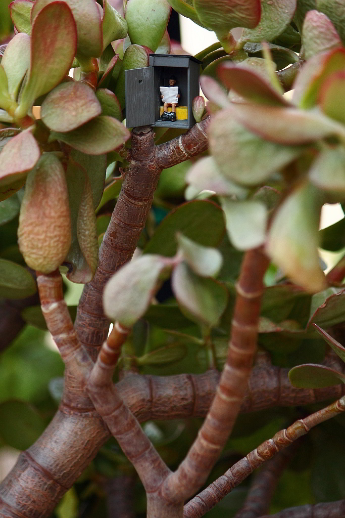 Lo sfocato a destra l'ho voluto io per dare profondità e portare l'occhio alla "casetta". ..ma se disturba.... La composizione l'ho spostata in alto sia per dare l'idea di un vero albero con l'uccellino (in realtà è una normale pianta grassa) e sia per stemperare un pò la gestualità della miniatura. Non volevo che l'occhio ci cadesse subito.