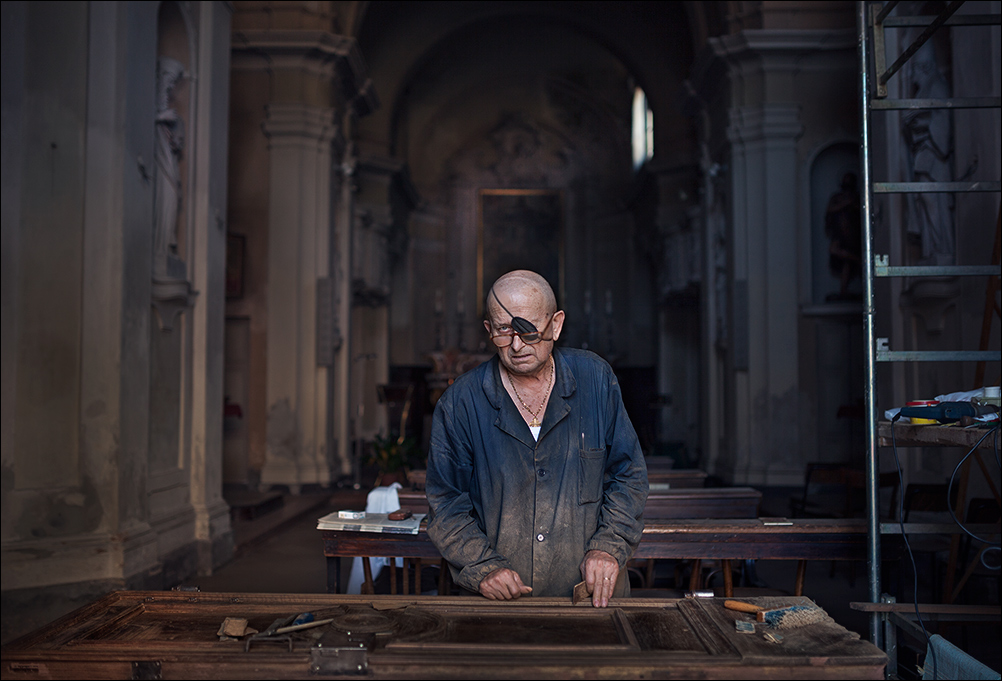 Quando il ritratto ambientato trova una felice realizzazione, come qui, è sempre un bel ammirare: è sempre motlo difficile questo traguardo. Disogna saper creare un giuto mix di elementi fra protagonista e ambiente stesso, senza dimenticare il racconto del momento. Lui fa parte di questo mondo rappresentato, anche cromaticamente. E il viso come imbronciato, ci restituisce un burbero benefico, amorevolemnte geloso del suo lavoro, per un istante diffidente per affetto delle cose che ama, ma pronto a concedersi allo scatto fra le sue mansioni di vita.