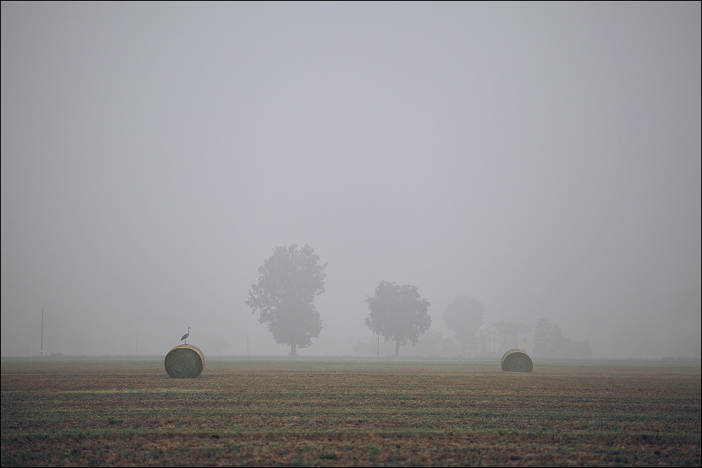 L'airone sulla rotoballa su un campo strisciato di ocra e di verde, poi la nebbia che via via stende il suo velo.
