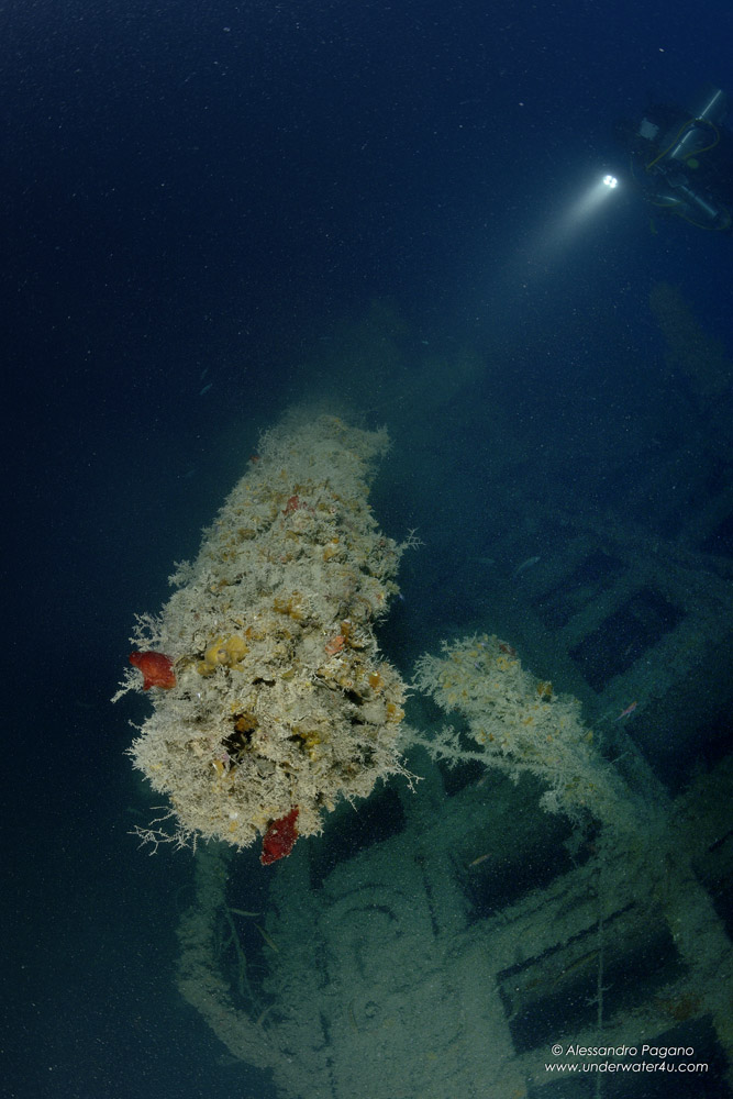 E la foto di "copertina" con il grande cannone completamente concrezionato e in alto a sinistra il mio collega che ne illumina il basamento.