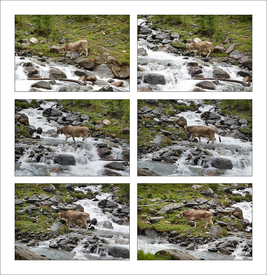 Dopo qualche attimo di titubanza il bovino si è timidamente avventurato nel fiume... ha una zampa alzata quasi su tutte le foto, come se non volesse bagnarsi... mi sa che è femmina, divertentissimo