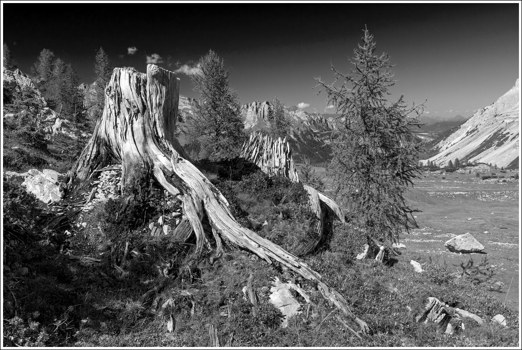 Silvano, mi sono fatto 1000 metri di dislivello e 20 km tra l'andata ed il ritorno per fotografare sopratutto questi ceppi di larice; in questo posto ci ero stato quasi 30 anni fa ed il ricordo era ancora vivo. Mi ero già prefigurato in B&N queste immagini postate. Ho passato 4-5 ore intense su questo grandioso altipiano, qui si alternano larici enormi schiantati dai fulmini e ceppi, sempre di larici, che furono tagliati nel 1850 per la ferrovia del Brennero. Siamo nel gruppo del Brenta poco sopra il lago di Tovel.
