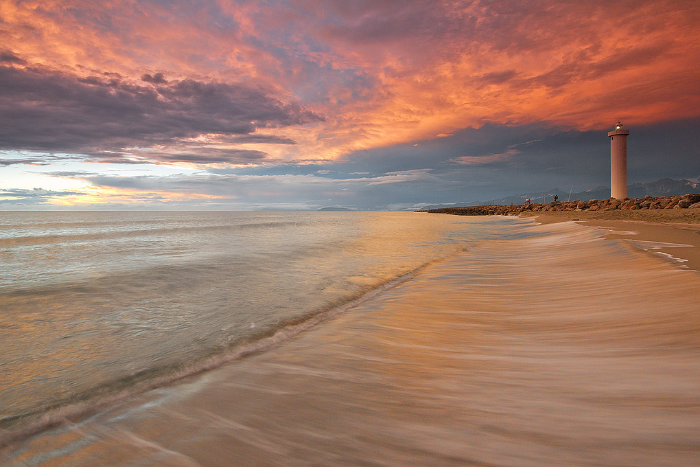 Eccellente luce. La risacca con il tempo leggermente lungo crea delle piacevolissime linee diagonali che danno dinamicità alla composizione. Forse un po' troppo decentrato il faro. Il cielo completa la costruzione di questa bella fotografia.