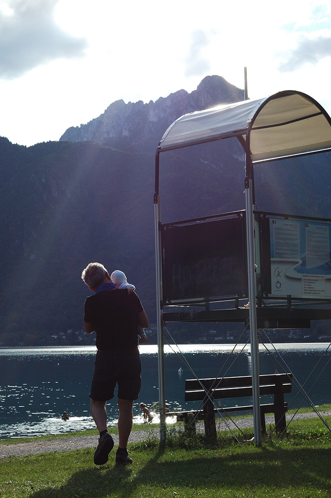 -la composizione mi sembra approssimativa, uno scatto al volo insomma: se ti piaceva immortalare tuo suocero che mostrava il lago alla piccola (congratulazioni per il batuffolino !) il punto di ripresa non era dei migliori. I soggetti presi di spalle raccontano poco, solitamente; ci sono fior fiore di eccezioni, ma non è questo il caso: anche l'atteggiamento corporeo ( che a volte 'parla' più di un volto) di protezione e calore, lo si immagina ma non viene mostrato quasi per niente.