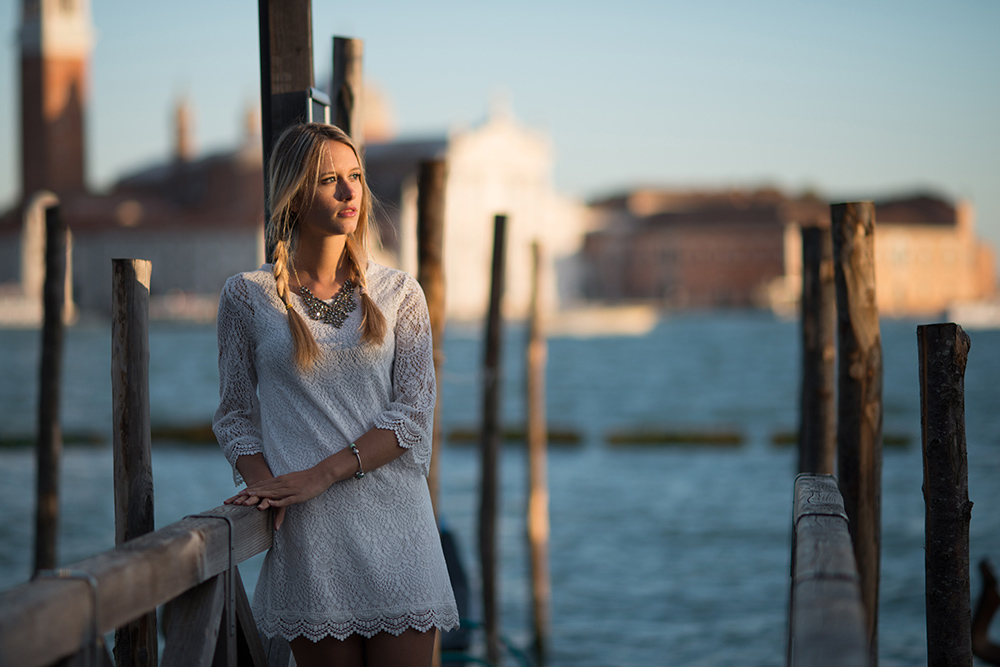 Una saturazione soffusa e calda sul viso che contrasta con la splendida resa del bianco in ombra del vestito.