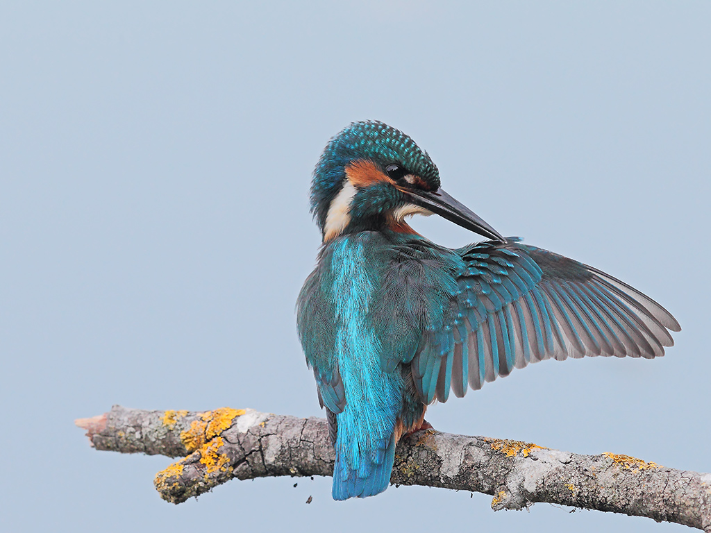 Bello scatto del martin nell'atto di pulirsi il piumaggio, ottimi tutti i parametri  |