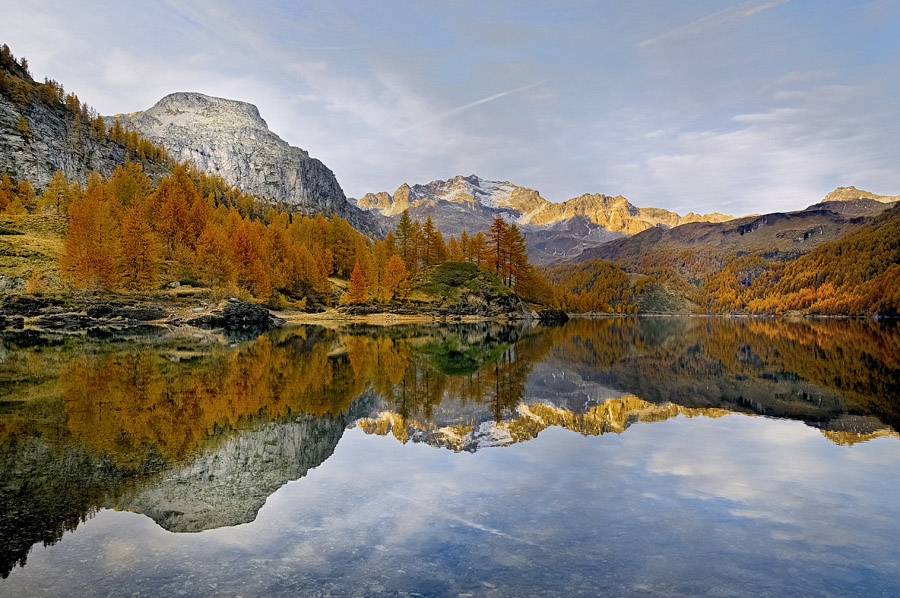 Una fotografia paesaggistica giocata sull'ultima luce, sulla perfetta composizione, sul bel riflesso dell'Arbola, sui prepotenti colori dell'autunno e, da ultimo, anche sul primo piano dato dal riflesso delle nuvole tra i sassi del fondo che ancorano l'immagine alla realtà in cui è stata scattata. Una fotografia molto bella che, anch'io annovero tra le tue migliori.