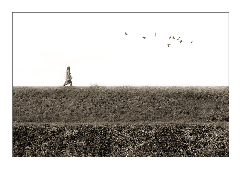 Immagine gradevole, in cui il volo di uccelli sembra aprire e guidare la strada alla passeggiata sull'argine della signora...ciao  |