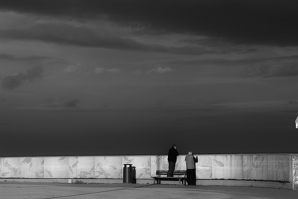 Mi piace l'enorme massa di cielo scuro che sormonta i due uomini che si affacciano, ognuno come può, per vedere cosa c'è al di là della muro, però un pochino potevi avvicinarti...