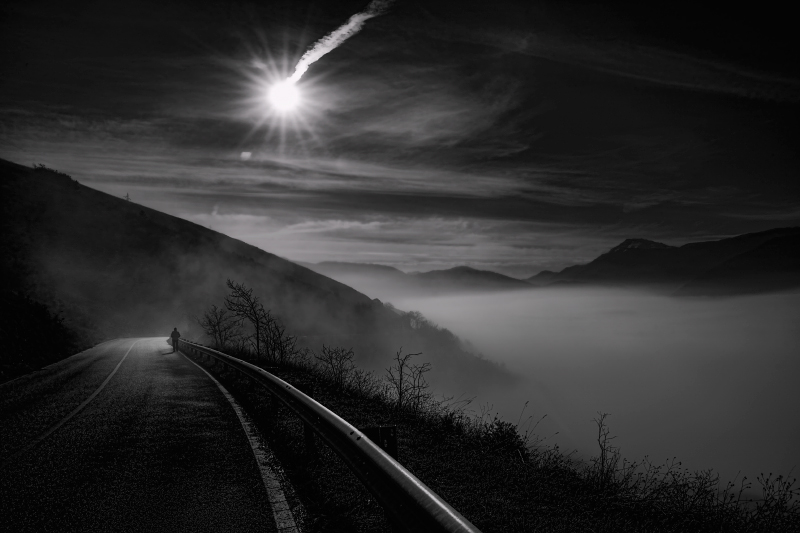 La tua idea qui si fa illuminazione visiva, e si umanizza nel protagonista in cammino. Letteralemnte andare verso la luce, con la anticipazione di bianco della nebula sospesa che accompagna il percorso. Complimentoni Alex, per i tuoi risultati in dpchallenge: ormai le idee corrono fotograficamente scorrevoli e veloci come precisi lanci di frecce!
