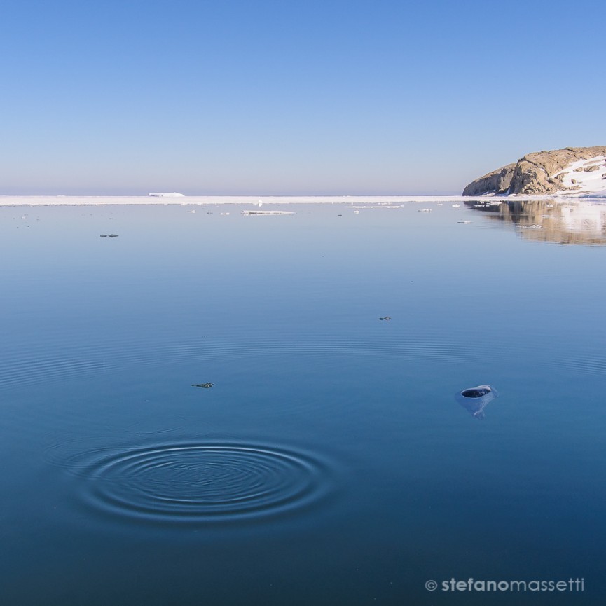 Un riquadro di azzurro, luminoso ed immobile, non fosse per il cerchio elegante che si allarga a pelo d'acqua. Delicatamente dosata e composta, forse per questa sua apparente semplicità un po' sottovalutata al primo sguardo.