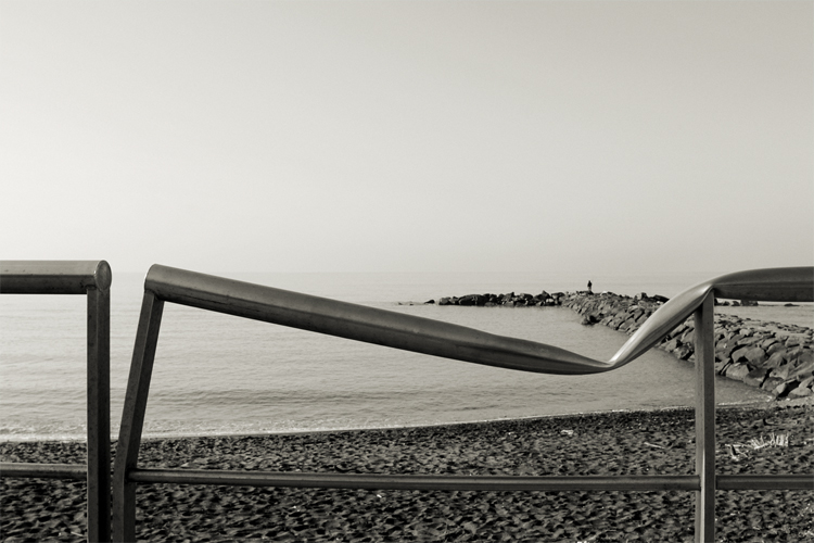 Raffinata intuizione compositiva, nella quale il peso formale del "punctum", cioé l'omino in lontananza, viene sottolineato dalla piegatura del metallo della ringhiera.