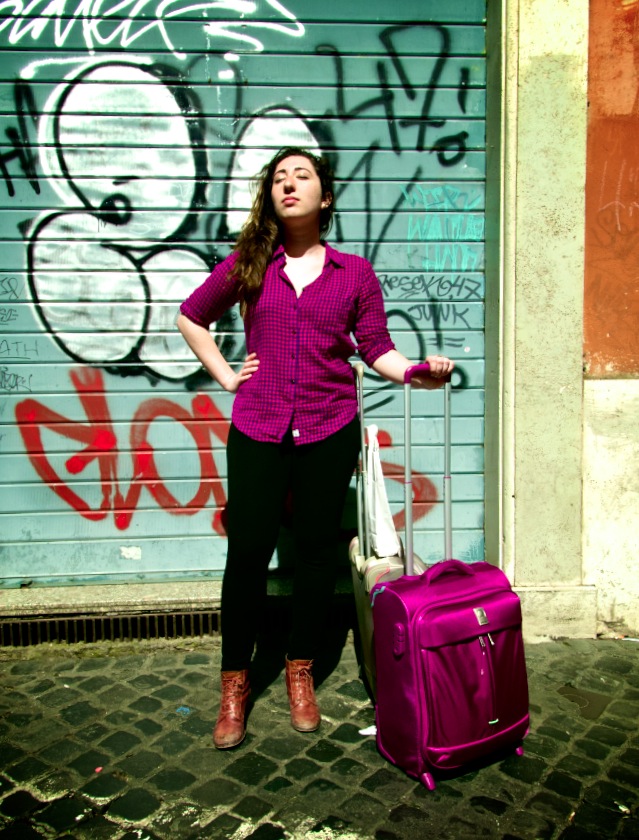 Che dire, a me piace. L'abbinamento cromatico fra maglietta a quadri (orribile) e trolley dello stesso colore, mi ha strappato un sorriso; tutto questo coacervo di kitsch fa da contraltare ad un atteggiamento un pò da diva della ragazza.