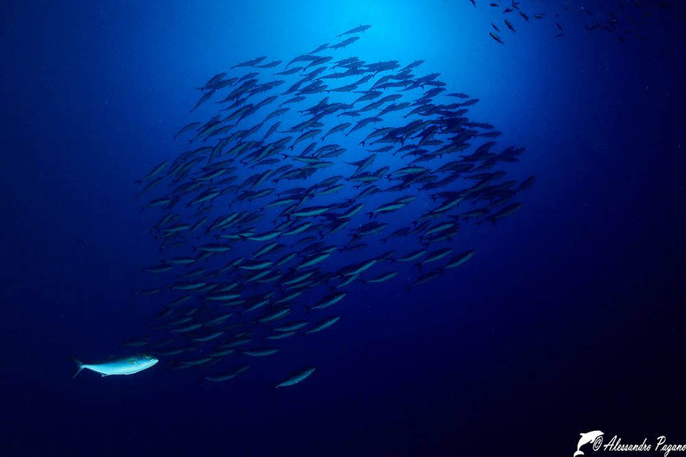 suggestiva questa nuvola di pesci con quell'unico esemplare al di fuori