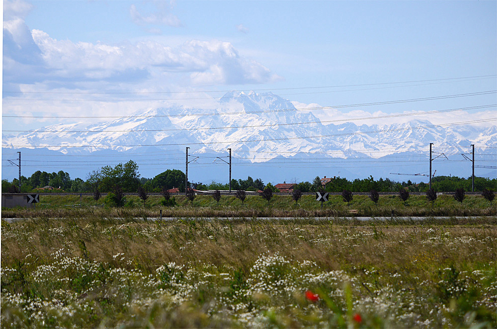 In effetti se il soggetto fotografico è il Monte Rosa (come da titolo), vi sono troppi elementi che distraggono. Cartelli stradali, cavi elettrici, tralicci, abitazioni ecc. sono tutti elementi di disturbo che si frappongono tra l'osservatore e il punto forte dell'immagine. Anche l'esposizione non è delle migliori, così come la scelta dei diaframmi che ha reso fuori fuoco il primissimo piano.