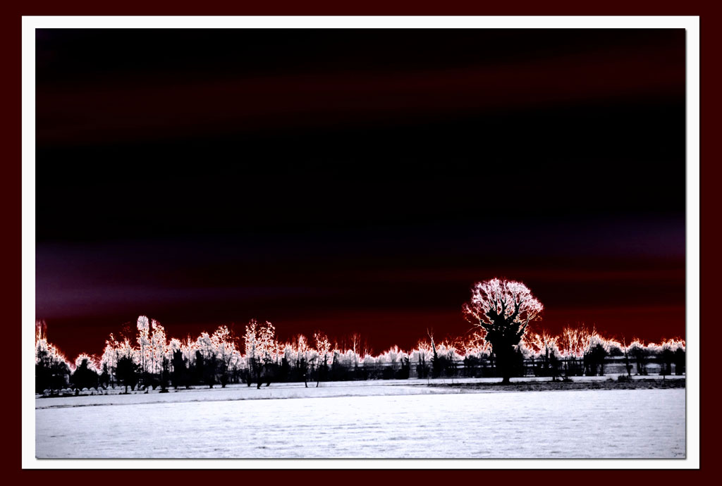 Ciò che balza all'occhio però è l'ampia area lasciata ad un cielo piuttosto anonimo (vista la mancanza di nubi e/o astri) e l'effetto alone attorno alle chiome degli alberi...apparentemente pure un'inclinazione verso sinistra....