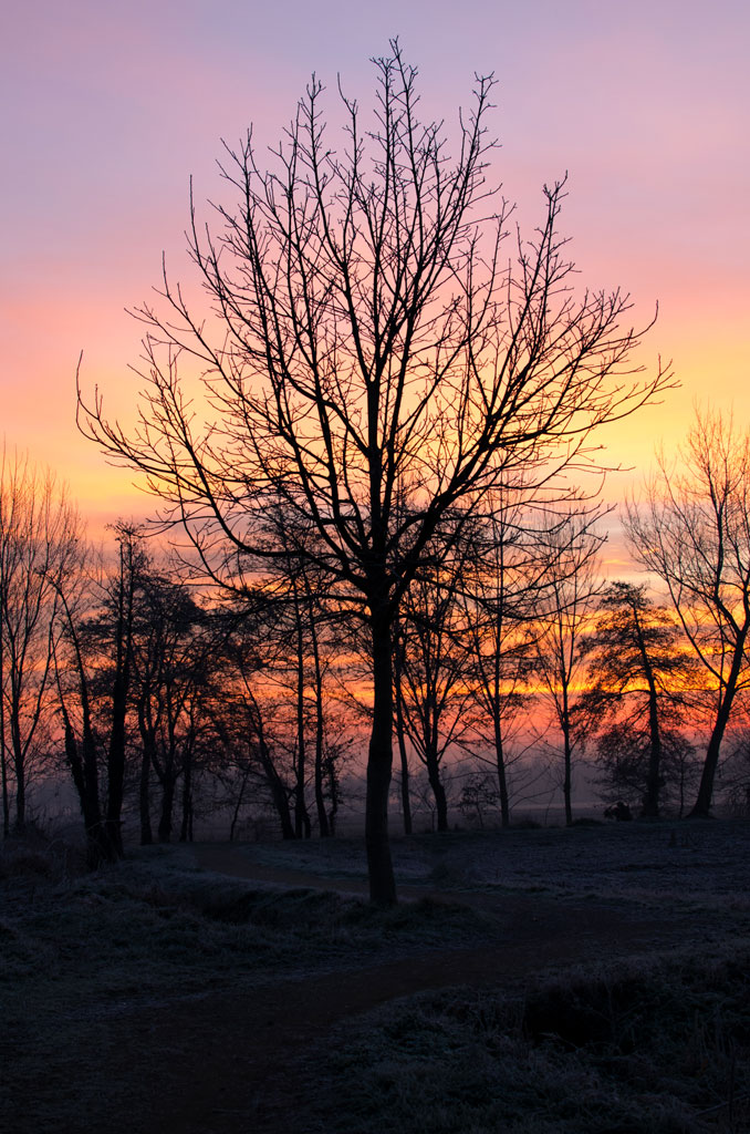 Immagine dal forte richiamo grazie all'effetto "texture" ottenuto con il riempimento del fotogramma da parte degli alberi stilizzati che staccano piacevolmente sul cielo infuocato...