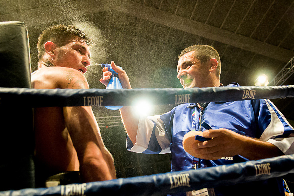 Il controluce mette in risalto sudore ed acqua nebulizzata in una scena che coglie un attimo intenso di rapporto tra pugile e secondo...