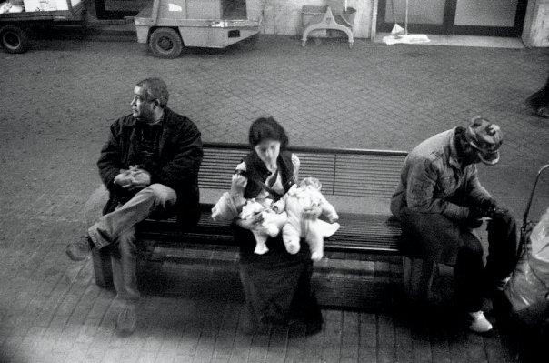 Per la tecnica va bene che è pellicola, e ne comprendo la grana, ma i neri sono troppo chiusi e la donna è molto mossa, potrebbe essere un vantaggio per la privacy però, il volto del tipo a destra è completamente illeggibile, per quanto concerne la composizione i macchinari e gli strumenti per le pulizie sono di forte disturbo e il carrello con le cose tipo a destra è tagliato a metà, quel piede sulla destra è più di disturbo che di rinforzo all'idea generale, che ancora non ho trovato (sarà un limite mio), in sostanza una foto che pare presa dalla finestra di un negozio o comunque in una situazione dall'alto e di fretta, questo sì arriva. |
