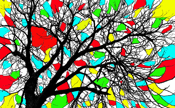 genialata!!... di kandiskyana memoria... qui si potrebbe colorare gli stati d'animo in infinite maniere... forse la scelta di mettere agli angoli i colori poteva essere esaltata d+ magari con una quadricomia di colori simili caldi .. che si avvicinano leggermente nel verso del tronco... come la primavera si accosta con dolcezza alla natura per risvegliarla...