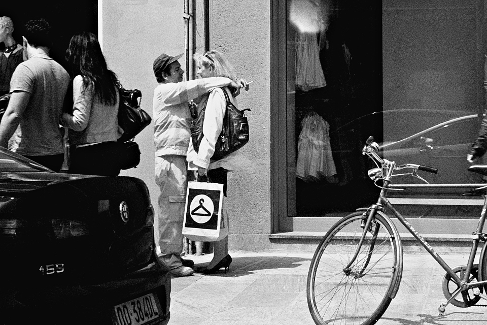 Il limite di questa foto dal b/n che immagino nativo di gran qualità, sta a mio avviso, in quel che mostra, ovvero una scena ormai usuale al punto da passare se non inosservata quasi. Nulla di eclatante è rappresentata se non la quotidianità. Il titolo aiuta a trovare un'attenzione che altrimenti sfuggirebbe.