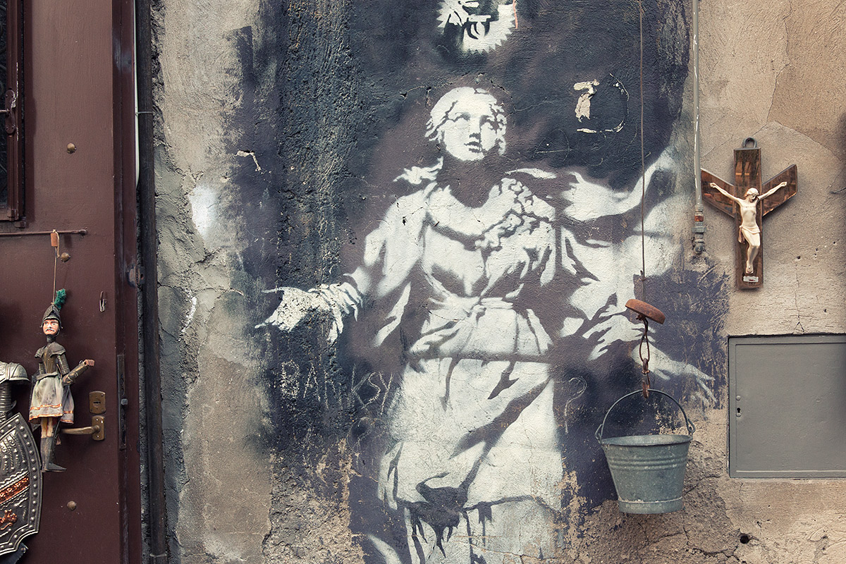 Interessante immagine ricca di riferimenti culturali e religiosi che caratterizzano la Terra di Sicilia.Non conoscendo le condizioni di scatto non so se erano possibili altri tagli e composizioni (pensavo ad un taglio verticale o quadrato che comprendesse tutta l'opera di Banksy).Complimenti per le notevoli suggestioni di questo scatto!  |