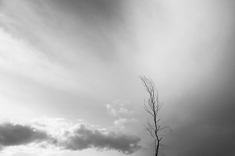 Istintivamente ti proporrei un taglio parziale alla nostra destra, che renderebbe la lateralità dell'albero più decisa e armonica. Ma potrebbe essere una scelta puramente estetica o formale, e la compo è cosa personalissima e in ogni caso la scena mi piace anche così, con questa presenza scarna, flebile nella ampia morbidezza di cielo e nuvole. L'alberello non ha base inclusa, lo si potrebbe immaginare sospeso in una realtà quasi irreale.