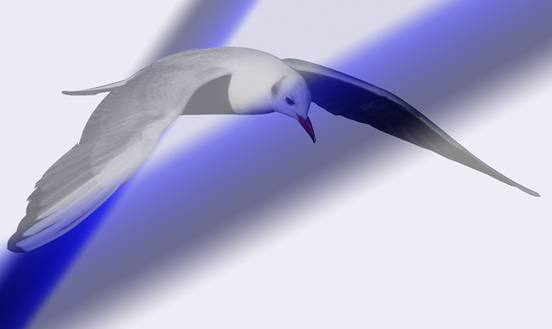 Ho scontornato con lo strumento penna (Photoshop) il gabbiano. Ho creato un livello nuovo sopra il gabbiano e qui ho tracciato due sfumatura lineari con due colori (dal bianco al blu o viceversa non mi ricordo).