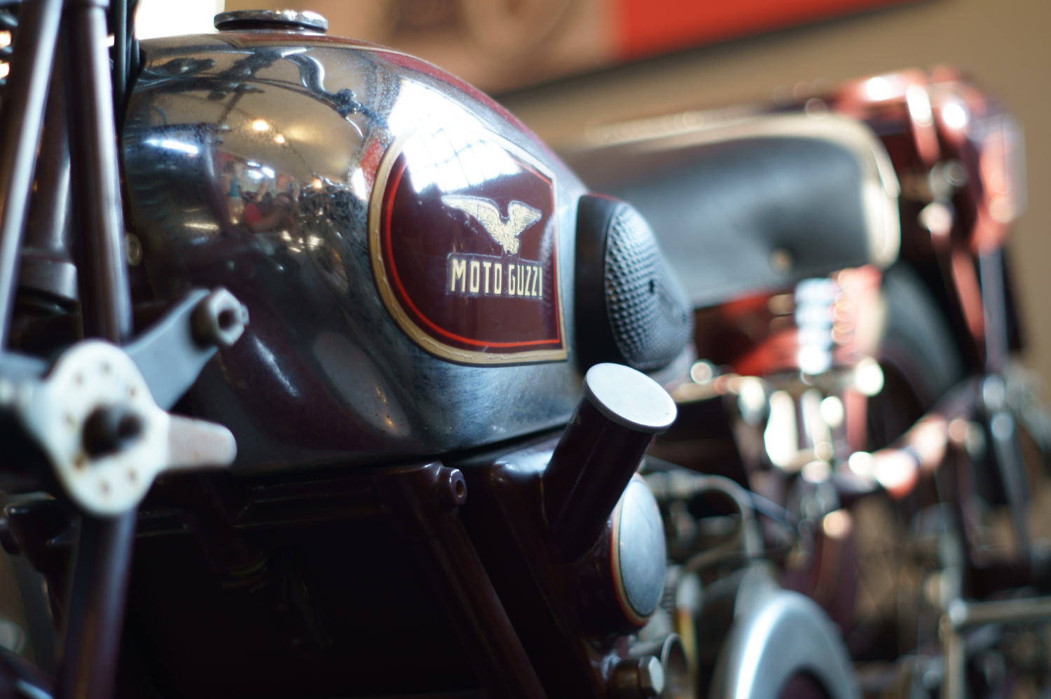 Trattasi del museo Moto Guzzi di Mandello del Lario con moto parcheggiate in leggera pendenza; lo spazio di moviento era poco e ho cercato di "interpretare" il riflesso come meglio potevo.