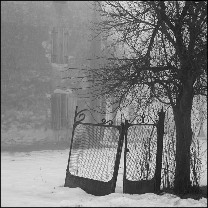 Atmosfera tra il malinconico ed il reminiscente per questo bianco e nero rafforzato dall'elemento cancello ( o di quel che ne rimane) che spicca tra manto nevoso, alberi e vecchie case