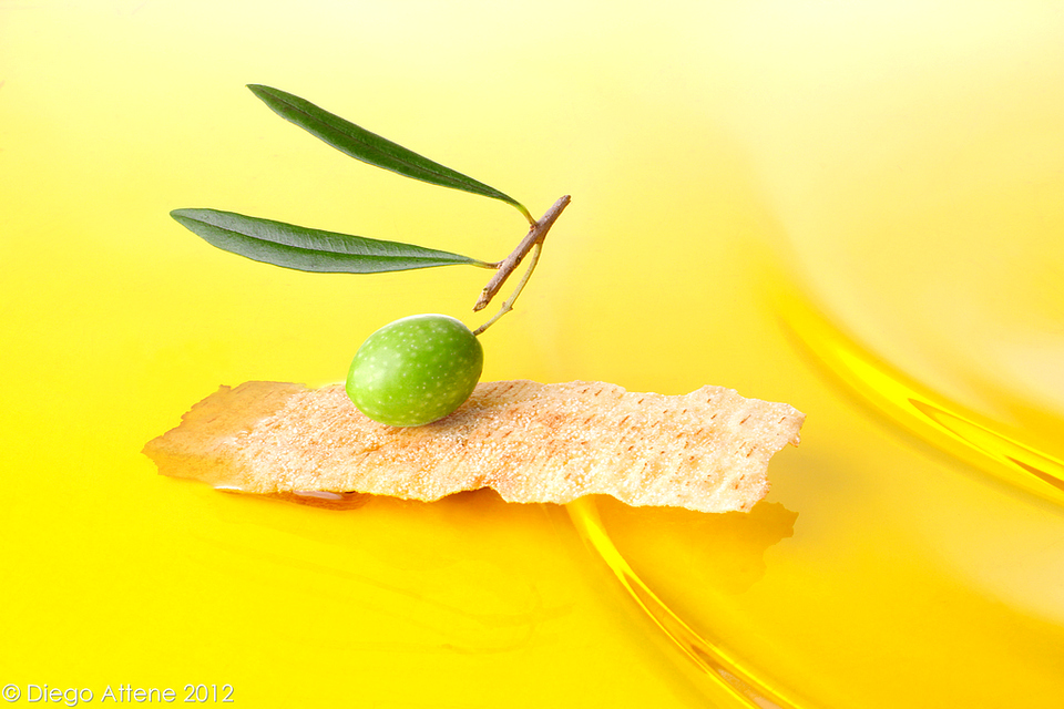 Una zattera a basse calorie, che scivola su di una mare oleoso di canarine tonalità... Simpatica l'oliva che fa il surf... acrobaticamente assecondata dalla doppia vela di foglie.