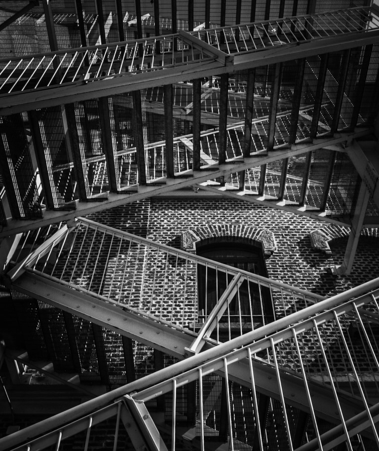 Ti do il mio parere assolutamente non tecnico, d'istinto. Mi piace in molti parametri, sopratutto , a parte il soggetto molto interessante per me ( le scale antincendio d'oltre oceano, immagino, hanno sempre un ceto fascino), per il particolare punto di ripresa, nè dal basso nè pienamente frontale. Una obliquità, ampiamanente poi vignettata, che rende come nuovo, e più intricato, questo intreccio di saliscendi, questo ordinato disordine. Nè un vero inizio, nè una uscita alta... solo la possibilità remota, ma oscura, di una alternativa, la finestra, lungo il percorso.