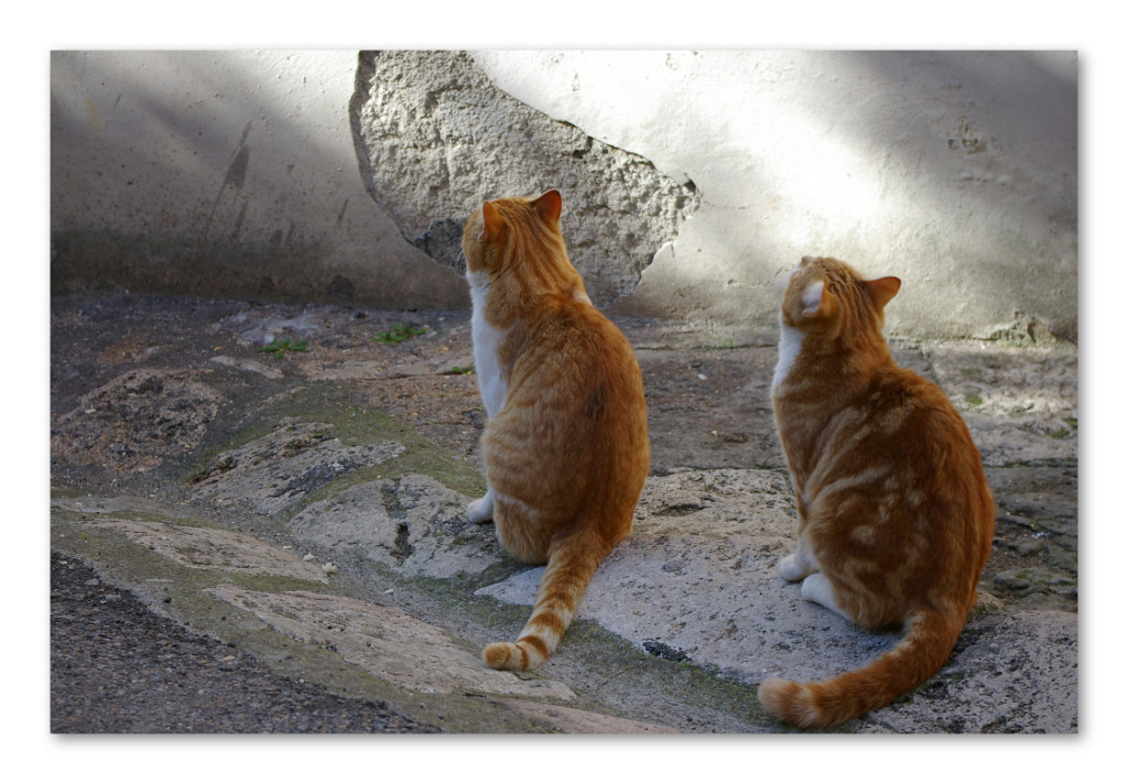 Simpatica la "clonazione" dei due mici in posa, come se fossero gemelli, l'idea è buona, certo sarebbe stato meglio vedere la loro espressione. Lo sfondo della foto è molto brutto..