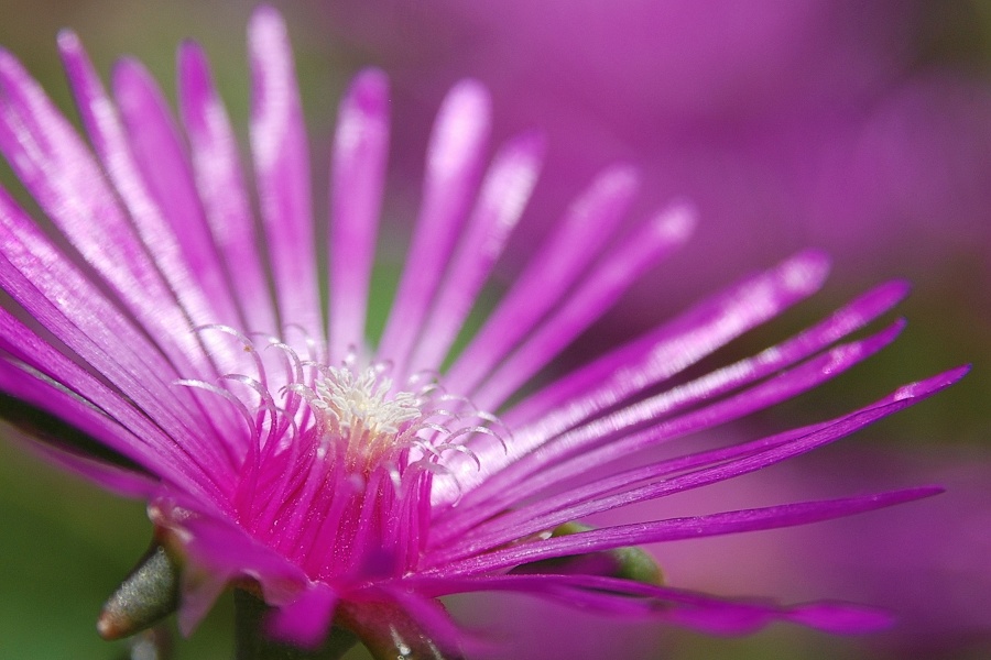 Bene la messa a fuoco sui pistilli e gradevole lo sfondo con l'altro fiore sfocato a destra del frame...vedo un eccesso di luminosita' ,una leggera sottoesposizione in fase di scatto o durante la post produzione avrebbe giovato all'immagine secondo me
