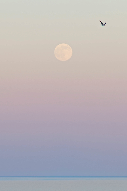 A titolo mio personale, non è detto che sia cosa condivisa, la trovo perfetta. Di estrema delicatezza, quasi impalpabile in tinte e contorni ,eppure senza impastamenti. Spazi dilatati fra luna e altri elementi, un respiro che sembra non finire, distanze di generosa metratura. Eppure ogni cosa al suo posto. In quella che credo di interpretare come tua idea emotiva. L'infinitamente grande, in proporzione, del satellite lunare, e la piccola ma libera progressione del volo, la delicatezza dell'ora ,che stempera ogni contrasto e differenza. E lo spazio riservato al nostro pianeta, al mare di base , e proporzionalmente a questi valori di universo e atmosfera, giustamente sottilissimo. La avrei apprezzata tantissimo in paesaggio, ma va bene anche così.
