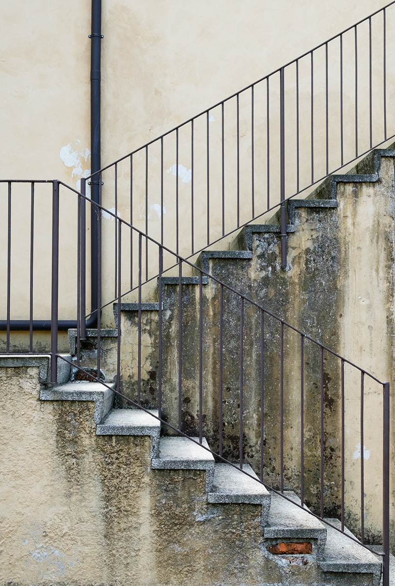C'è bellezza, armonia, anche dove apparentemente avanzano segni del tempo e sfaldamenti di materia. Sta solo nel saperla proporre al meglio per renderla leggibile all'altrui sguardo. La L del tubo di grondaia segna quasi una naturale demarcazione fra il sali ed il scendi del percorso. il punto di arancio del Mattone che fa capolino in basso, sotto l'intonaco del gradino, è poca cosa, ma qui fotograficamente importante, come un saldo aggancio , una nota tonale che spezza la austerità dell'insieme. Anch'io ho una cosa che ha delle affinità con la tua foto in galleria. E quindi non può che piacermi.