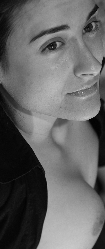 è un taglio strano che non mi dispiace, che evidenzia la prorompente femminilità della ragazza ed il suo sguardo furbetto; qualche particolare, però, mi pare sottovalutato, come il profilo che è disturbato dal colletto scuro del vestito e come l'evidenza dell'altro seno. Resta una foto sensuale.