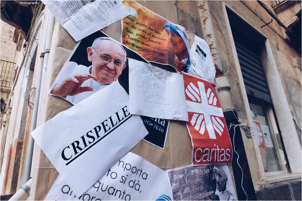 Perfetta apertura visiva, con la scritta che crispelle, che balza subito agli occhi ( il lato prosaico del racconto) ma sotto le foto di Papa Francesco e Madre Teresa ( quello più serio...) , tanto per introdurre l'argomento. Ma che anche nella assonanza della radice.. cris...di crispelle e cris di cristianità, si strappa senza irriverenze, un sorriso...