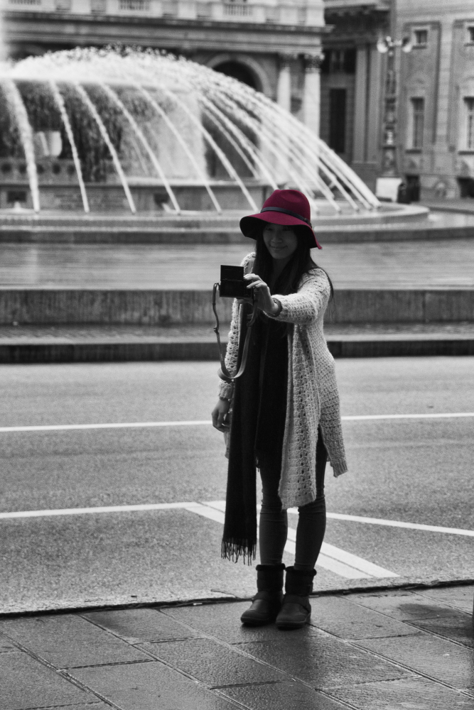 scelta sbagliata a mio avviso, la de-saturazione , diciamo che non la trovo coerente con la fotografia street, dove dovrebbe essere l'attimo ripreso a reggere la scena, mentre qui il centro d'interesse sembra spostato sul cappello..secondo me sminuisci uno scatto potenzialmente buono, l'espressione della ragazza e sopratutto la sua postura sono fantastiche..