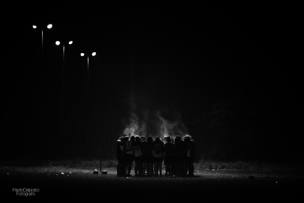 Quei tre lampioni in lontananza mi piacciono da impazzire, così come il fumo del fiato dei giocatori che ci racconta una giornata fredda che si può affrontare solo insieme.