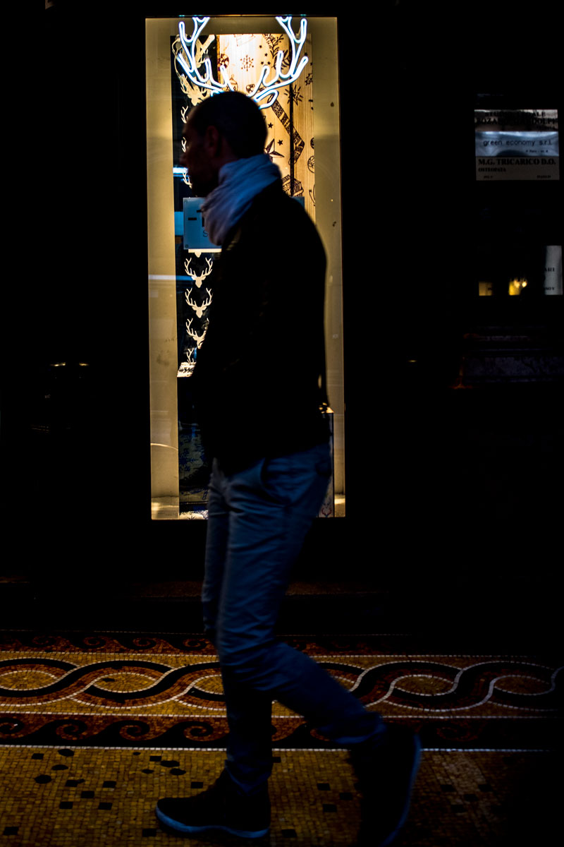 Non so se sia una scelta voluta o meno, ma il passante che si trova nel momento esatto per avere le "corna" come da titolo, non e' chiaramente leggibile, molto scuro, anche le parti laterali anch'esse molto scure, a beneficio si della vetrina illuminata che contiene l'oggetto/soggetto, ma il tutto diventa di difficile lettura a mio avviso...