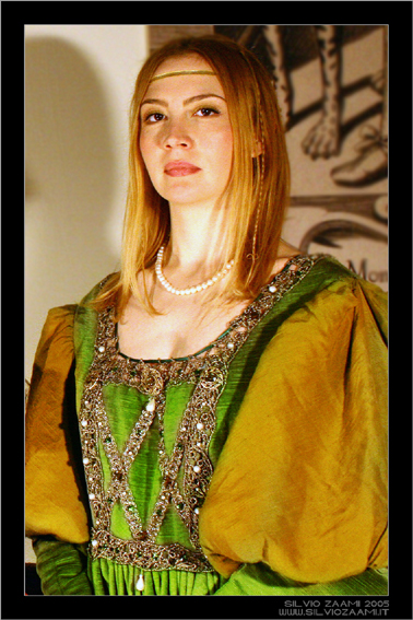 La posa, il taglio e l'espressione della modella li trovo adeguati al contesto. Non mi convincono tre cose, la nitidezza dell'immagine che mi sembra un po' sfuocata, il fondale che è tagliato (bella sia con l'immagine medievale, sia con il fondale bianco, ma non mezzo e mezzo), e il colpo di flash che appiattisce l'immagine bruciando parte dell'incarnato e illuminando ilr esto con una luce troppo dura.