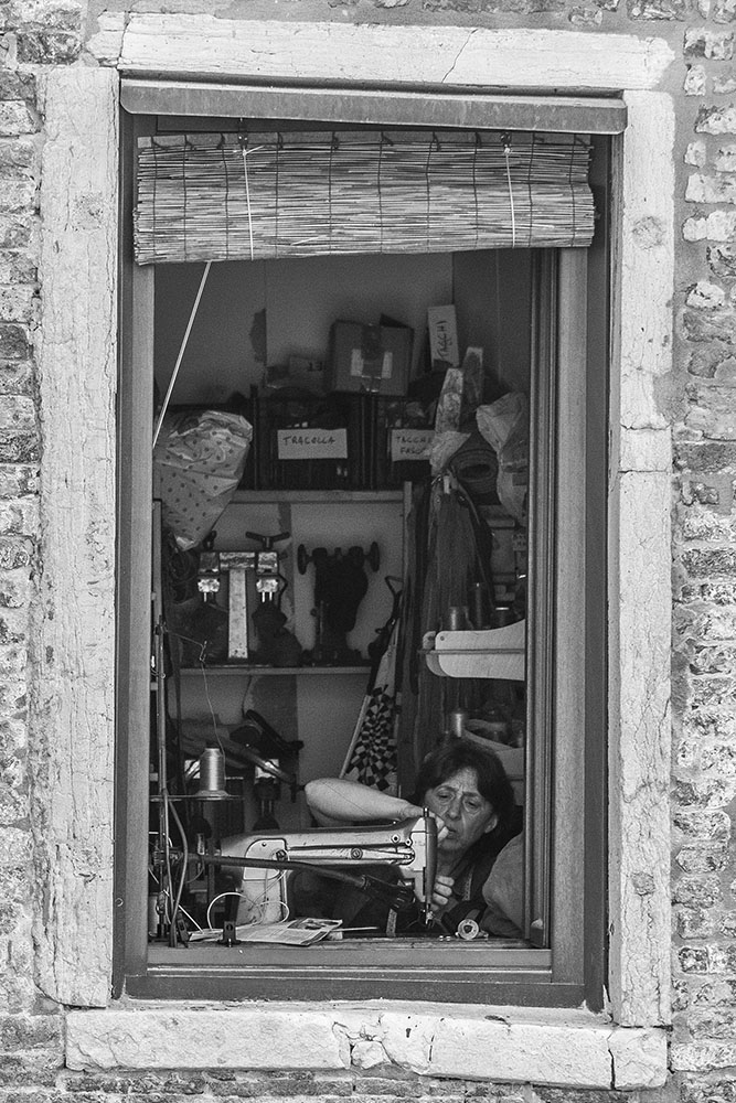 Ciao, trovo molto buona l'idea della "finestra" che introduce l'osservatore in una dimensione artigianale, mostrando una sarta all'opera.
