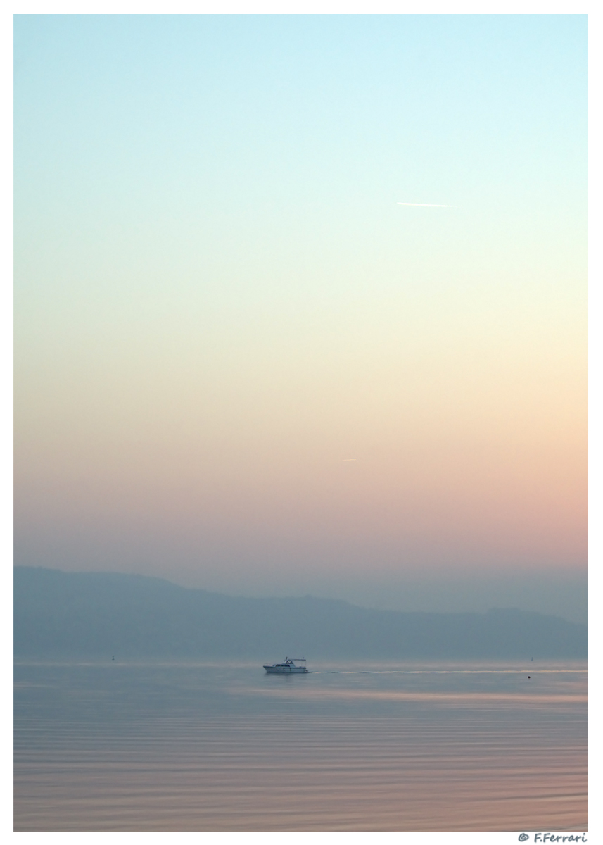 La scia della imbarcazione, che sfiora appena il silenzio che si fa sentire in questa bella proposta, dalle sfumature dolci e graduali di colore , e dal cielo alto ,che fa seguito alla quiete delle acque del lago.